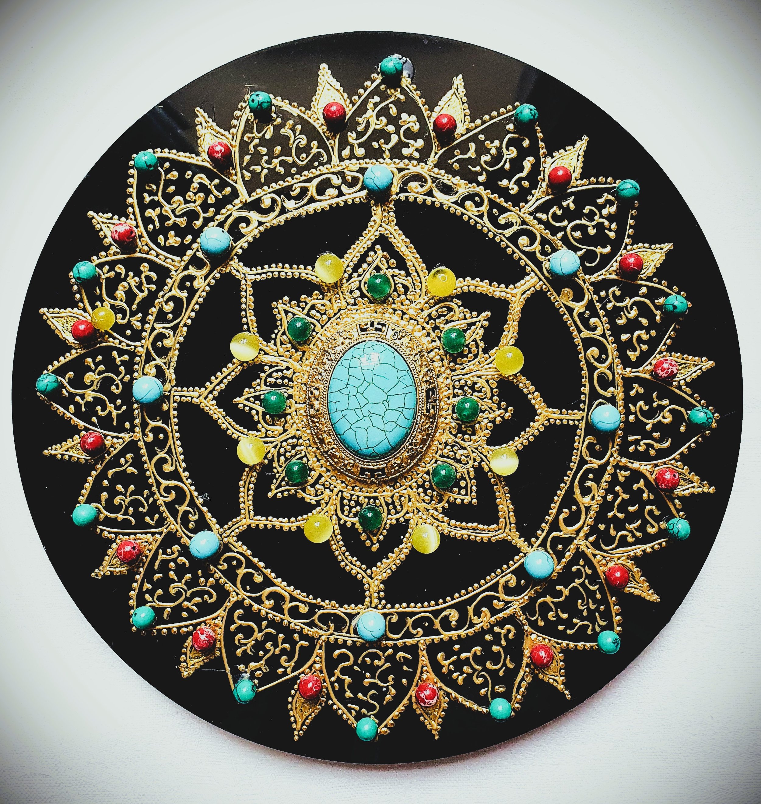 "More than a work of art, this mandala is a profound conductor of prosperity and personal power. Featuring celestial Turquoise—the ancient stone of leaders and victors—it opens pathways to new opportunities and creative triumphs.
