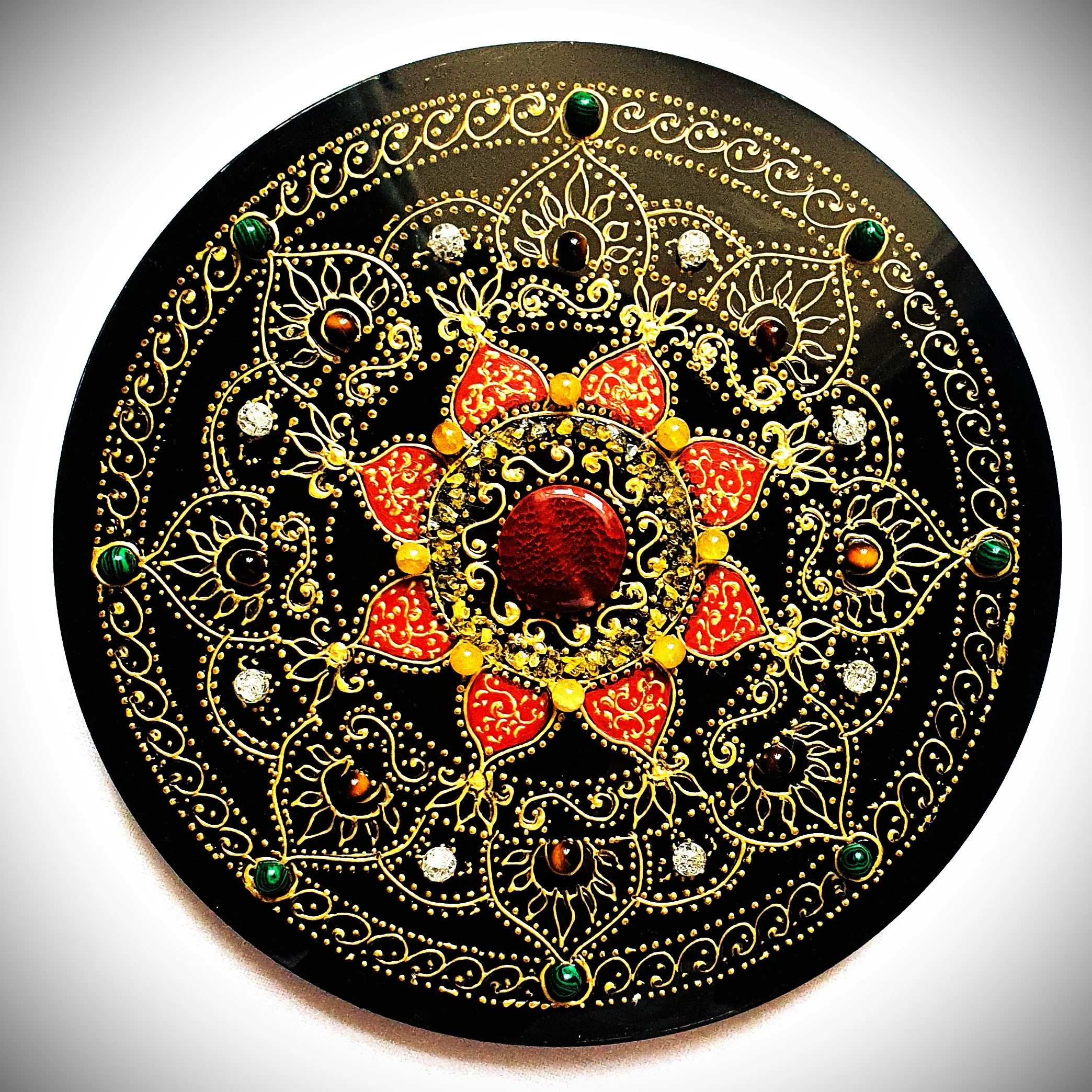 "This mandala is the ultimate embodiment of fiery success and unwavering confidence. At its core glows Red Agate, a stone that grants the determination and stamina needed to reach grand ambitions. Citrine, historically known as the 'Merchant’s Stone,' works in synergy with Honey Agate and Tiger’s Eye to manifest a powerful vibration of financial prosperity and luck.