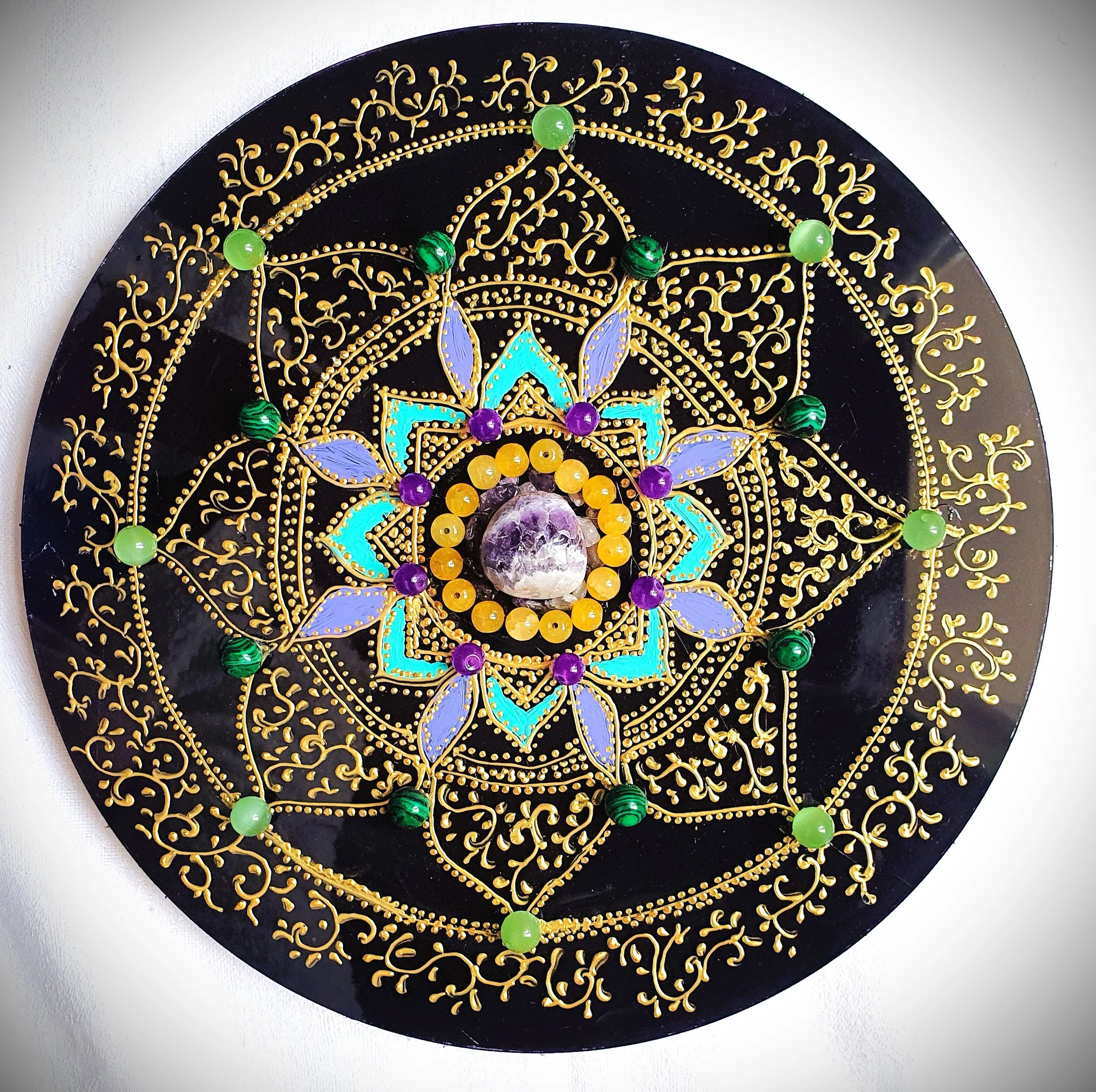 "This mandala is a conductor into the world of higher harmony and intuitive knowledge. At its heart glows a majestic Amethyst, the stone of spiritual purity and wisdom, which refines the mind and opens access to deep insights. The surrounding Lavender Amethyst and Honey Agate create a soft yet powerful vibration of serenity, balancing emotions and filling the space with the light of well-being.